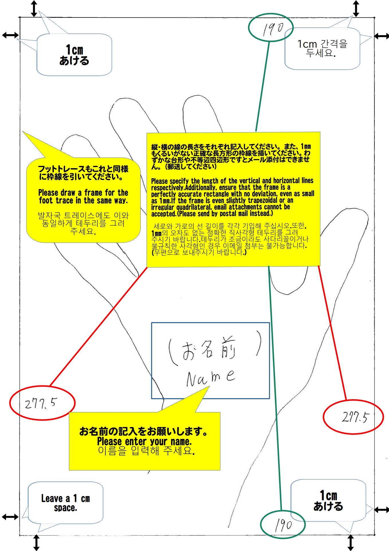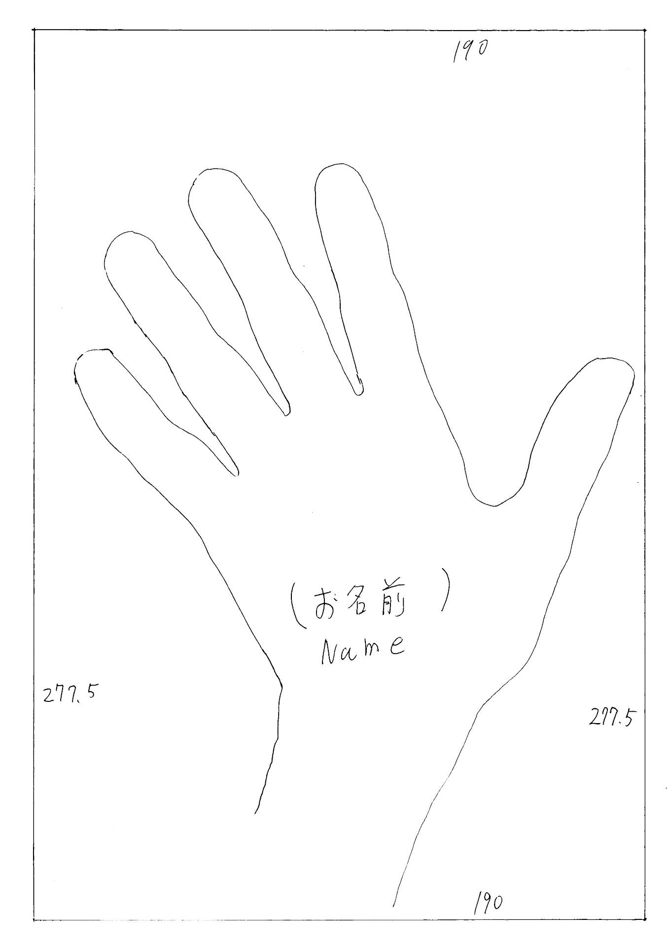 Please prepare one sheet of A4 copy paper each for hand tracing and foot tracing. Mail the traced paper of your "right hand" and "right foot."