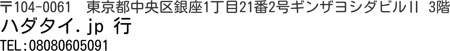 - 「ハダタイ.jp」としっかりお書きください。架空請求詐欺対策のため、1文字でも異なると受領できません。(よく "." ピリオドが抜けていたり、 ".jp" を入れてなかったりと店名の表記がいいかげんなケースが目立つようです)